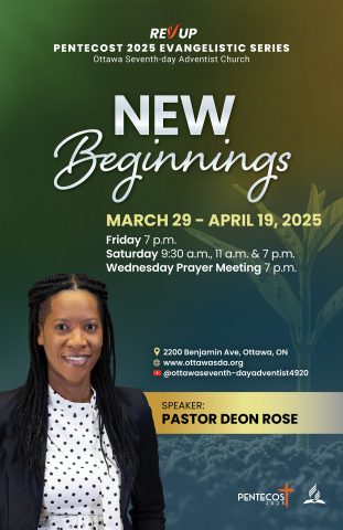 Join us this Sabbath, April 12, 2025, for the continuation of the New Beginnings Pentecost 2025 series. Come for Sabbath School at 9:30 a.m. where we will study the Bible together, and Divine Service at 11:00 a.m. where the series’ evangelist, Pastor Deon Rose, will present the sermon entitled “Fulfilled.”