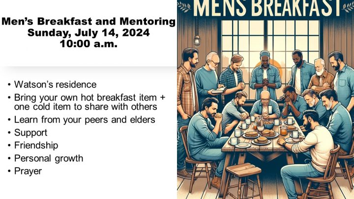 Men of all ages are invited to Men’s Breakfast at the Watson’s residence at 10:00 a.m. Bring your own hot breakfast item and one cold item to share with others. Come out for friendship, mentoring, support and prayer. See Wanito Bernadin or Marc Barker for details.