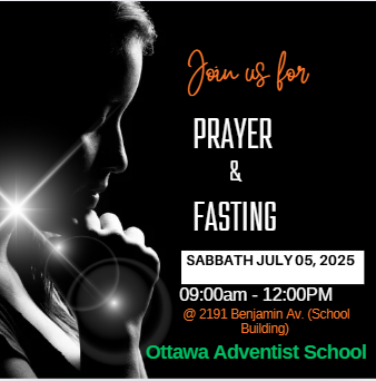 As committed partners in the growth of Ottawa Adventist School, we warmly invite you to join us in a time of PRAYER AND FASTING this Sabbath, July 5. Together, let us seek God’s continued blessings, guidance, and vision as we move His school forward in faith and purpose.