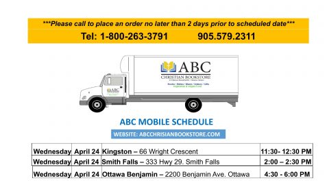The ABC Christian Bookstore will be at the Ottawa Adventist Church Wednesday, April 24, from 4:30 p.m. to 6:00 p.m. Please call 1-800-263-3791 or 905.579.2311 to place an order no later than two days prior to the scheduled date. https://