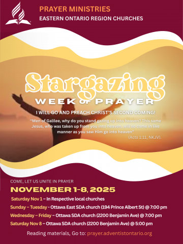Please join us for a Week of Prayer scheduled for November 1–8, 2025.This is a special opportunity for spiritual revival, united prayer, and a deeper connection with God and one another. Let us join together as a worldwide church family in seeking the Holy Spirit's guidance and renewing our commitment to God's mission in these last days. See the poster for details on location and times.