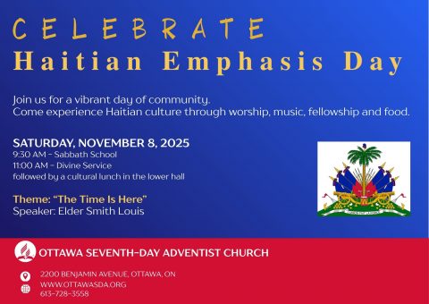 Join us for Haitian Emphasis Day from Sabbath School at 9:30 a.m., Divine Service at 11:00 a.m. followed by a cultural lunch to celebrate fellowship and Haitian heritage. Theme is "The Time Is Here! " with speaker Elder Smith Louis. We invite friends from and of Haiti to wear the colors of the Haitian flag.
