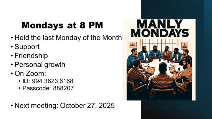 Brothers, Men’s Ministries invites you to the Manly Mondays every last Monday of the month at 8:00 p.m on Zoom. This is your chance to unplug from the week’s demands and plug into authentic fellowship with like-minded men.