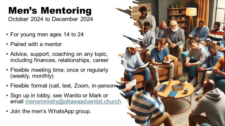 Men’s Mentoring for young men ages 14-24. You will be paired with a mentor who will offer advice, support and coaching on any topic including faith, finances, relationships, career, etc. Meetings are flexible and you can meet once or regularly via phone call, text, Zoom, in-person, weekly or monthly. Please sign up in the lobby, see Wanito or Marc, email mensministry@ottawaadventist.church. You can also join the men’s WhatsApp group.