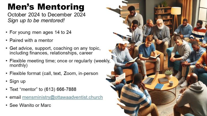 You asked and God delivered! Are you a young man 14-29 years old? Men's Ministries invites you to get a male mentor. You will be paired with a mentor who will offer advice, support and coaching on any topic including faith, finances, relationships, career, etc. Meetings are flexible; you can meet once or regularly via phone call, text, Zoom, in-person, weekly or monthly. Please sign up by texting the word “mentor” to 613-666-7888, emailing mensministry@ottawaadventist.church, or seeing Wanito or Marc.