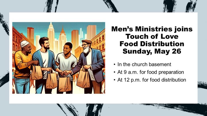 Men’s Ministries will join Touch of Love in distributing food at 12:00 p.m. Come for 9:00 a.m. to prepare the food packages in the lower hall.