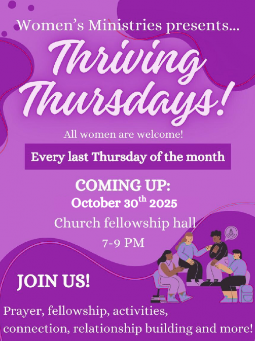 Women’s Ministries “Thriving Thursdays” resumes on October 30 in the church basement from 7:00 p.m. - 9:00 p.m. Join us at the Breathing Nest: a calm space to come experience a moment of peace, prayer, and creative arts.